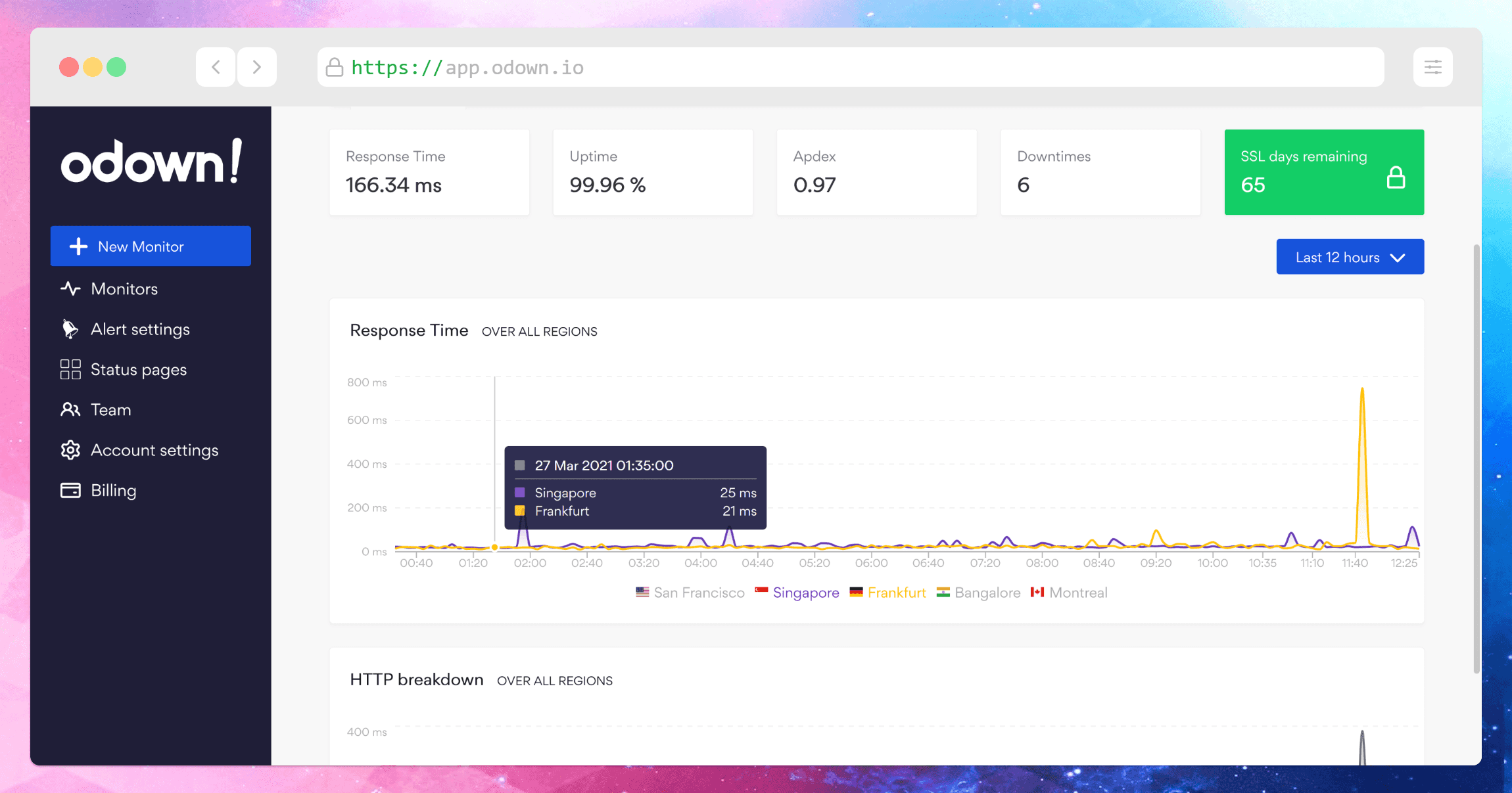The new endpoint's availability is continually checked by simply adding it to Odown's app without any extra configuration. Its uptime and response time are displayed for the given date period across several regions (California, Singapore, Sydney, Frankfurt, and more), and historical data is displayed after a few minutes.