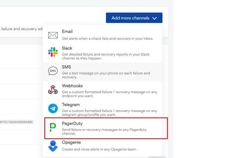 - Navigate to the alert settings tab on the account screen ,click the Add more channels button and choose PagerDuty option.