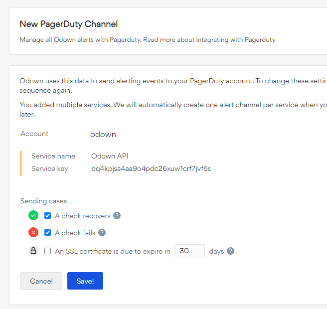 - Back in Odown, you should see your Pagerduty integration credentials reflected in the alert settings. Don’t forget to hit Save Pagerduty channel.