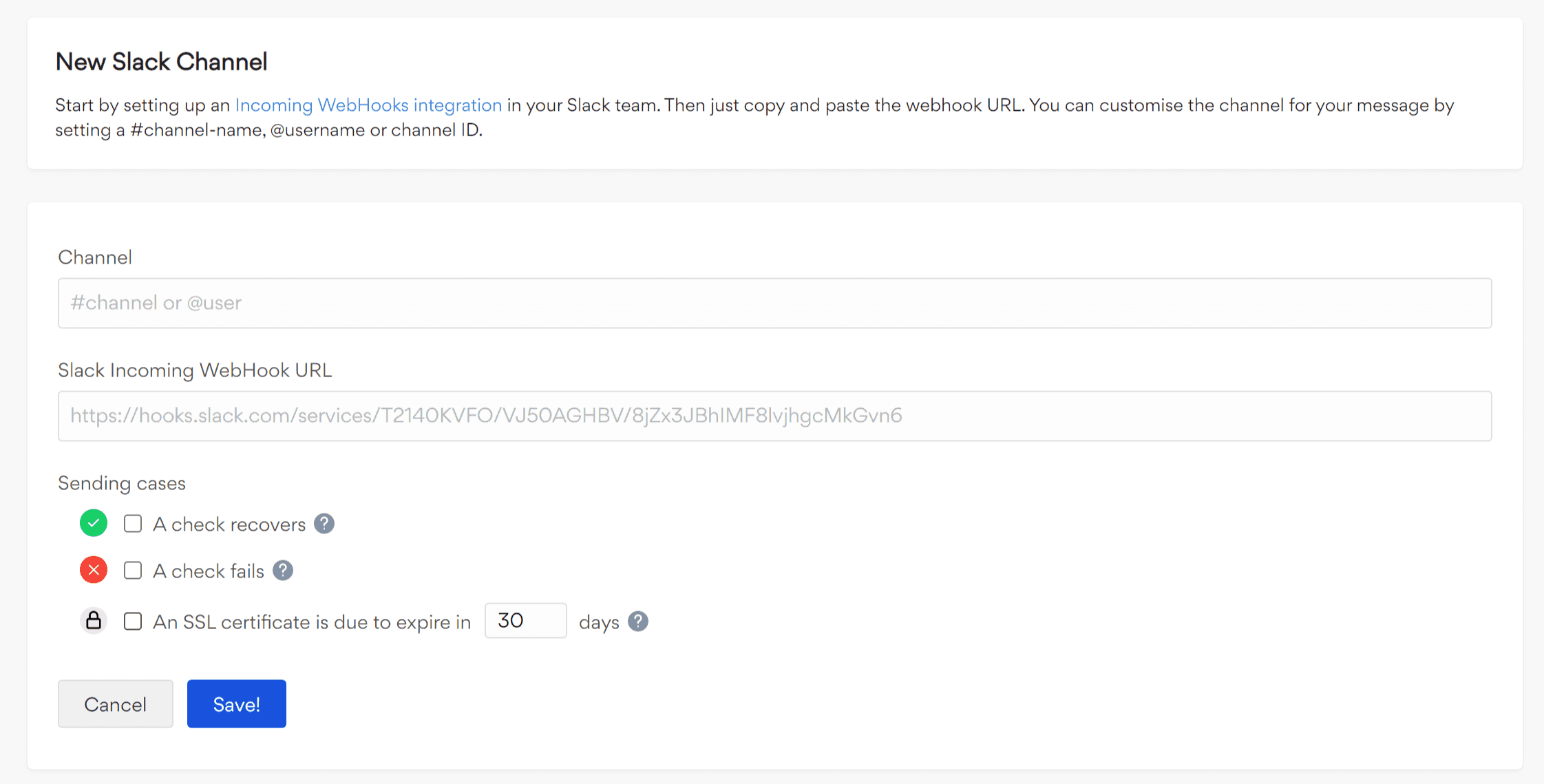 In Odown, go to Alert Settings -> Add More Channels -> Slack and paste your URL to add it as an alerting channel: